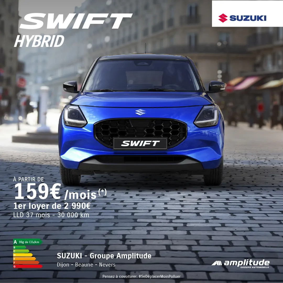 (1) Location Longue Durée pour 37 mois et 30 000 kilomètres pour une Suzuki Swift 1.2 Hybrid Avantage, 1er loyer de 2 990 €, puis 36 loyers de 159€. Offre réservée aux particuliers, valable dans le réseau participant du 01/04/2026 au 30/04/2026 inclus, en France métropolitaine sur le véhicule neuf Suzuki Swift, selon stock disponible. Sous réserve d’acceptation de votre dossier par Suzuki Finance, département de Cofica Bail, S.A. au capital de 14 485 544 €, 399 181 924 RCS Paris, siège social : 1 boulevard Haussmann 75 009 Paris, ORIAS n° 07 023 197. Modèle présenté : Suzuki Swift 1.2 Hybrid Pack hors option peinture métallisée So’Color, aux mêmes conditions puis 36 loyers de 192€/mois. Les loyers comprennent les services associés suivants (en option et dans les limites et conditions prévues aux contrats de LLD et d’Assurance) : Garantie Perte Financière, souscrite auprès de Cardif Assurances Risques Divers, S.A. au capital de 21 602 240 €, Siège social : 1, boulevard Haussmann, 75 009 Paris – 308 896 547 RCS Paris - Entreprise régie par le Code des assurances et soumise à l’Autorité de Contrôle Prudentiel et de Résolution, 4 Place de Budapest – CS 92459 – 75 436 Paris Cedex 09, pour les garanties Valeur d’Achat, Assurance complémentaire et Evènements imprévus, et d’Icare Assurance, S.A. au capital de 2 358 816,00 euros - B 327 061 339 R.C.S Nanterre - Siège social : 93,rue nationale 92100 Boulogne-Billancourt ; Entreprise régie par le Code des assurances et et soumise à l’Autorité de Contrôle Prudentiel et de Résolution, 4 Place de Budapest - CS 92459 - 75436 Paris Cedex 09, pour la garantie d’Assistance Véhicule de remplacement et est distribuée par Cofica Bail en qualité de courtier en assurance. Conditions et limites de garanties disponibles sur simple demande. Tarifs TTC clés en main conseillés au 01/04/2026. Garantie jusqu'à 10 ans : voir détails sur suzuki.fr ou auprès de votre concessionnaire.